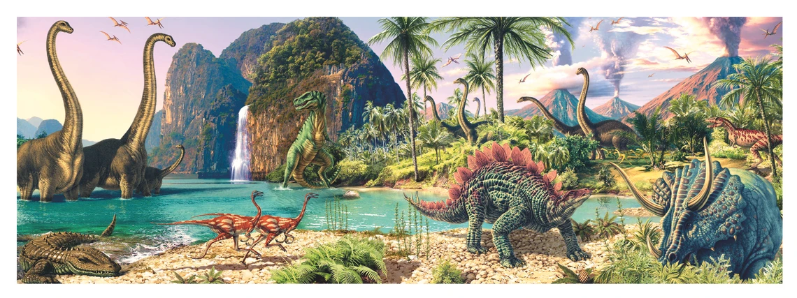 Дори децата да смятат, че лично сте преживели праисторията, имате шанс да ги подведете. Покажете им истински динозаври на пъзел от 150 части. Върху Т-рекса, стегозавъра, бронтозаврите и други изчезнали създания те ще упражняват концентрация, въображение и внимание. Не забравяйте да залепите готовата картина в панорамен формат и да я поставите на стената в стаята. Пъзелът е произведен от висококачествен и безвреден картон.