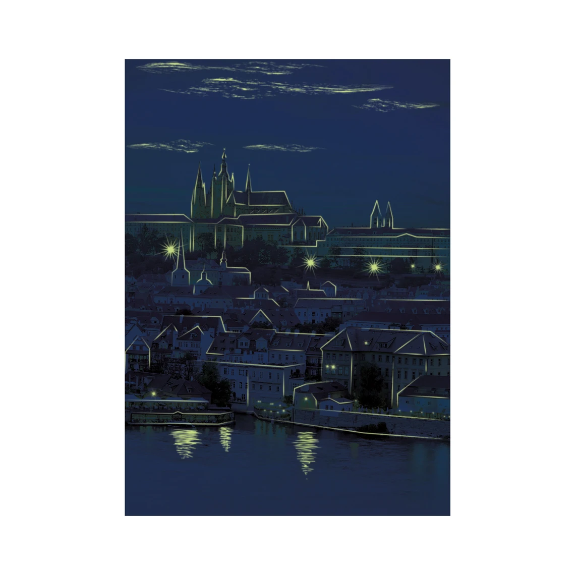 Панорамата на Храдчани грее в далечината ден и нощ. Как да накарате и дома си да свети? Наредете го от неоновите елементи. Пъзелът от 1000 части включва неонови части, които светят в тъмното. Достатъчно е да имате една или две вечери на творческо забавление и след това да залепите готовата картина и ще получите оригинална декорация.