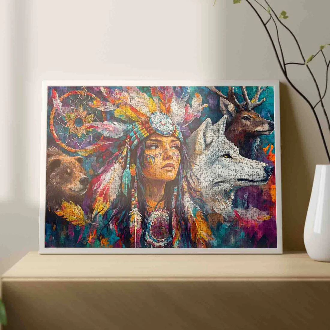 Пъзелът Племенен духовен войн е повече от просто игра. Той е произведение на изкуството, което оживява част по част под пръстите ви. Сглобяването му е медитативно преживяване, което стимулира ума и ви откъсва от натовареното ежедневие. Пъзел 1000 части Племенен духовен войн е част от колекцията Индианци